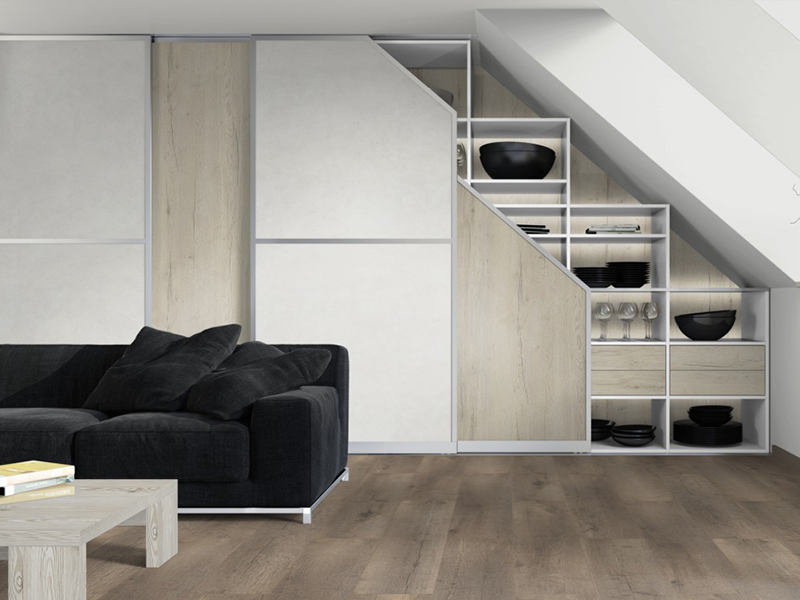 Имитация брашированной поверхности древесины мягких пород с изысканным перламутровым эффектом возникает за счет матовых и глянцевых элементов. В сочетании с этой структурой однотонные декоры смотрятся как окрашенная или лакированная поверхность массива древесины.