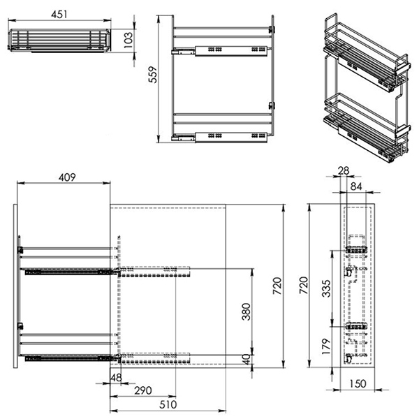 Бутылочница в базу 150 мм Квадро-1 с доводчиком, правая, графит