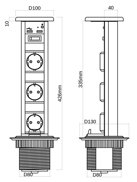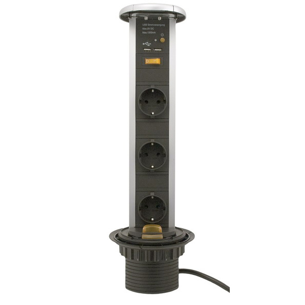 Блок розеток выдвижной вертикальный, 3 EURO, 2 USB, 250В, серебристый, 2м
